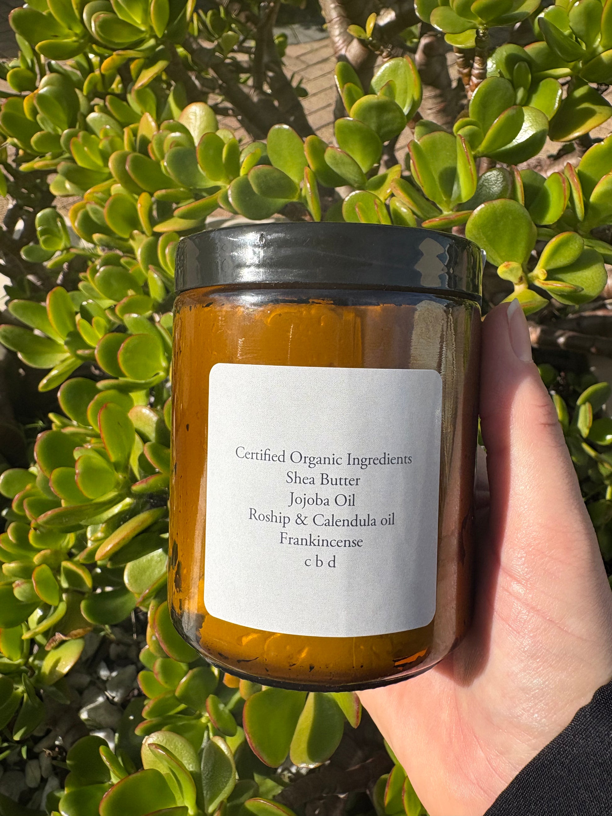 Shea Butter, Jojoba Oil, Calendula infused Rosehip oil, Frankincense & c b d